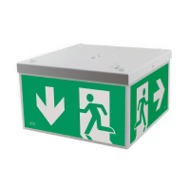 Beschreibung Rettungszeichenleuchte ZIBAL 40 E Robuste Rettungszeichenleuchte mit vierseitigem Lichtaustritt. Ausführung gem. DIN EN 60598 T 2-22, DIN EN 1838. Piktogramm gem. DIN 4844. Gehäuse: Stahlblech, weiss, RAL 9016, Abmessungen: L404 x B404 x H226mm, Schutzart: IP44, Schutzklasse: I, Anschlussspannung: 230 V AC, Anschlussleistung: 15,2 VA, Erkennungsweite: 40m, Montageart: Deckenaufbau inkl. Kettenbefestigungsset, Dimmung: DALI (DIMD), Überbrückungszeit: 3h, Akku: NiCd/NiMh, Ausführung mit: SelfControl (SC), Typ: ZIBAL 40 E, Fabrikat: Elektroplanet AG